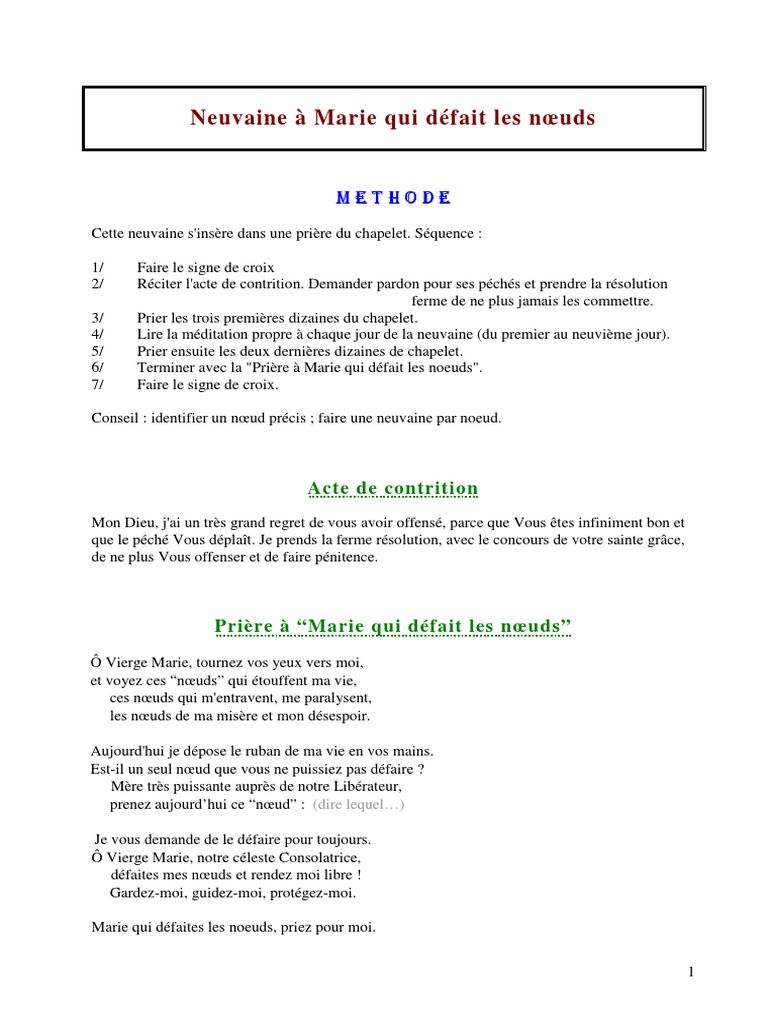 Neuvaine à Marie qui défait les noeuds. Quand nous luttons contre les mauvais penchants de notre nature corrompue venez à notre secours ô charitable Marie. Parmi toutes les prières à la Vierge Marie il en est une particulièrement belle et puissante que lon peut réciter dans les épreuves de notre vie.
